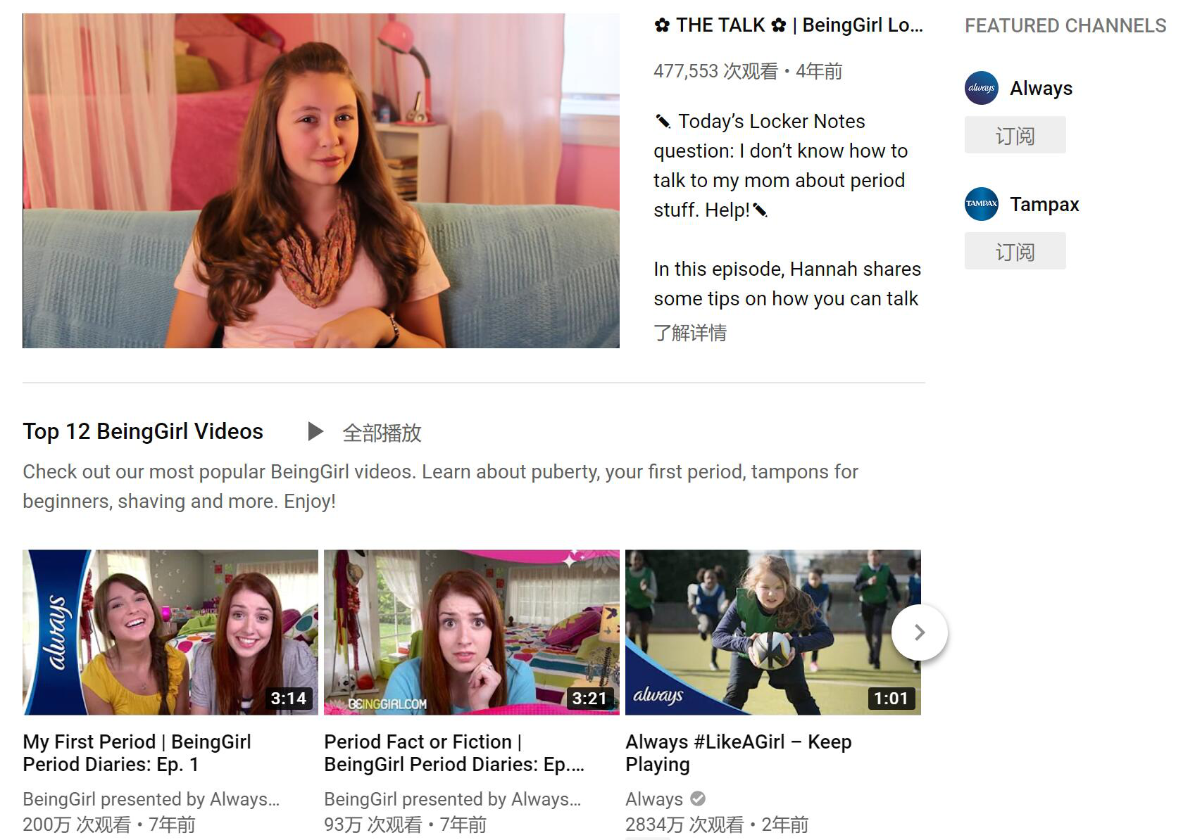 In order to increase the size and influence of “BeingGirl”, P&G not only operates this community on the webpage, the company also link “BeingGirl” to social media, including Facebook, YouTube and Twitter, because theses social networking sites are widely used among young girls, who are targets of this SMM campaign. For example, on YouTube, P&G created a channel for “BeingGirl”, uploading many videos theming girl topics, such as “Tampax Training Camp” and “Period Diaries”. At present, these videos are exclusively offered on YouTube in the name of “BeingGirl” series, with millions even billions of views. P&G also successfully creates a VBC for “BeingGilr” on Twitter. At the comment section on YouTube, it is not hard to find that viewers address one another’s questions, using @ function to remind their friends of the video they might also interest in. Doubtlessly, YouTube provides P&G a great alternative to expand the influence of the VBC “BeingGirl”. By commenting content presented in the VBC and interacting with others, followers of “BeingGirl” share information about particular personal care products and gain new knowledge about personal care as well. During this process, their engagement in P&G’s marketing and their loyalty to P&G products are likely to be improved.