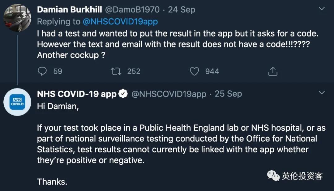 NHS Covid 19回復稱:“嗨,Damian,如果你的結(jié)果來自英格蘭公共衛(wèi)生實驗室、NHS醫(yī)院或者是國家統(tǒng)計局進行的檢測,那么測試結(jié)果目前還無法輸入這個APP,無論是陽性還是陰性。謝謝?!?