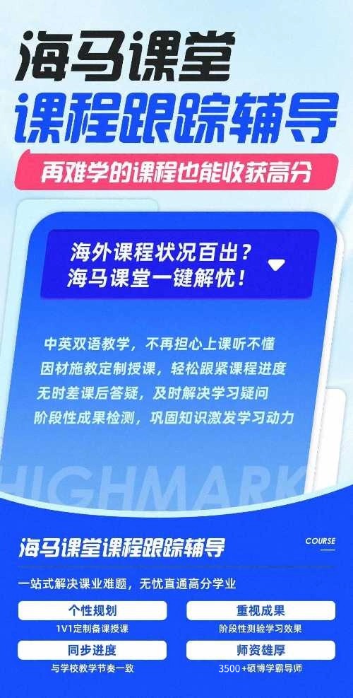 海馬中行業(yè)首推雙師模式,為留學生學業(yè)保駕護航。陪伴導師具有留學背景且教學經(jīng)驗豐富,懂學生痛點;教學出身的導師能提供專業(yè)學習規(guī)劃,精準避坑提升成績。該模式還為學生明確短期學期目標和長期畢業(yè)求職規(guī)劃,陪伴導師在線守護,讓留學之路清晰不迷茫。導師給予全面指導,覆蓋學習、升學和就業(yè),毫無保留分享經(jīng)驗,助力學生全面發(fā)展。
