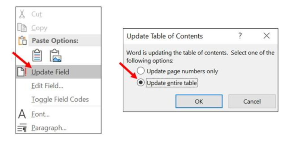 要更新頁碼,請右鍵單擊文檔中的目錄并選擇更新字段。然后,將出現(xiàn)更新目錄框。