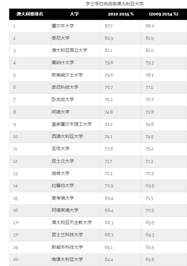 該表顯示,墨爾本大學的畢業(yè)率最高,在2010年開始攻讀學位的學生中,超過87%的學生在六年后的2015年底完成了學業(yè)。 另一方面,聯(lián)邦大學的畢業(yè)率最低,2010年開始攻讀學位的學生中,只有約36%在六年后的2015年底完成了學業(yè)。 這對聯(lián)邦大學來說是一個明顯的下降,前一年的完成率超過51%,但聯(lián)邦大學和其他類似的大學一樣,面臨著某些挑戰(zhàn),即在城市頂級大學中沒有代表的學生群體的保留。 聯(lián)邦大學已經(jīng)引入了指導、輔導和咨詢服務來解決這個問題。