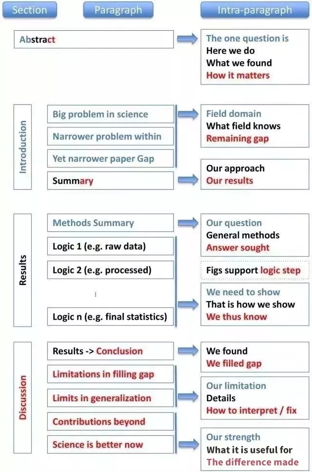 講故事的方法多種多樣,C-C-C 結(jié)構(gòu)作為其中一種,更適用于有耐心、決定花時(shí)間理解文章的讀者,但這種結(jié)構(gòu)對(duì)沒(méi)有耐心的讀者并不友善。好在當(dāng)代科學(xué)文章的結(jié)構(gòu)解決了這樣的問(wèn)題,標(biāo)題與摘要使讀者可以快速了解文章內(nèi)容。因此,看完引言的讀者很可能會(huì)被吸引,并有著足夠的耐心繼續(xù)閱讀文章。而且,過(guò)于注重 “內(nèi)容優(yōu)先” 的科學(xué)論文還會(huì)產(chǎn)生另一個(gè)風(fēng)險(xiǎn):讀者在閱讀過(guò)程中會(huì)忽視一些段落,這些段落可能是鞏固文章可信度的重要部分,從而使他們質(zhì)疑你的文章。因此,我們建議將 C-C-C 結(jié)構(gòu)作為科學(xué)文獻(xiàn)的默認(rèn)結(jié)構(gòu)。