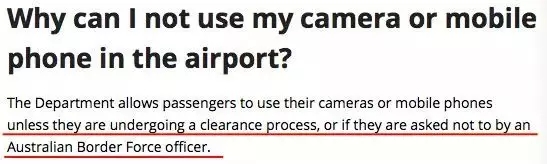這絕對(duì)不是危言聳聽哦,據(jù)澳大利亞內(nèi)政事務(wù)部(Department of Home Affairs)網(wǎng)站發(fā)布的相關(guān)規(guī)定,任何形式的通訊和拍攝設(shè)備,在機(jī)場、海港的海關(guān)和邊境控制區(qū)內(nèi),特別是在通關(guān)過程中,都是禁止的!