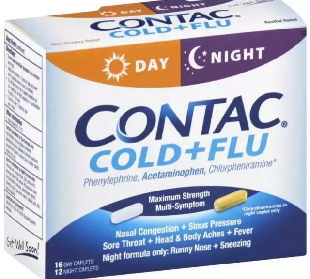 康泰克(Contac),和國(guó)內(nèi)的康泰克屬于同種。一盒里面有白天片和黑夜片,針對(duì)鼻塞、流鼻涕、流眼淚等癥狀。