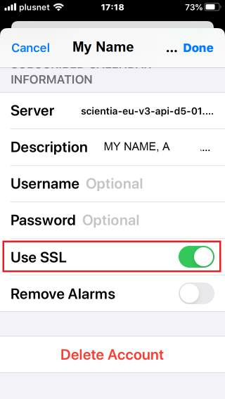 確保“Server”字段是“scientia-eu-..”,然后開啟“使用SSL(Use SSL)”選項(滑動按鈕為綠色)。