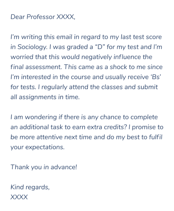 每封郵件的目的略有不同,因此你應(yīng)該在信的開頭明確說明目標(biāo)。確保你以禮貌的方式向教授發(fā)送請(qǐng)求的電子郵件。證明需要更好的成績,并解釋它如何影響你的GPA。提到你已經(jīng)意識(shí)到自己的錯(cuò)誤,將會(huì)在下次盡力而為。讓教授知道這背后有一些充分的理由。但不要讓它聽起來像借口。要明確表明你是一名認(rèn)真的學(xué)生,給教授發(fā)送最終成績的郵件對(duì)你來說并不是常事。