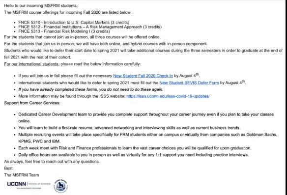 受到疫情的影響,很多學(xué)校為了便利學(xué)生,在開學(xué)之初就會(huì)郵件告知學(xué)生核心課程有哪些了。下圖就是康涅狄格大學(xué)給經(jīng)濟(jì)學(xué)研究生學(xué)生發(fā)送的郵件,學(xué)生可以清楚的看到核心課程的名稱、學(xué)分和課程代碼。