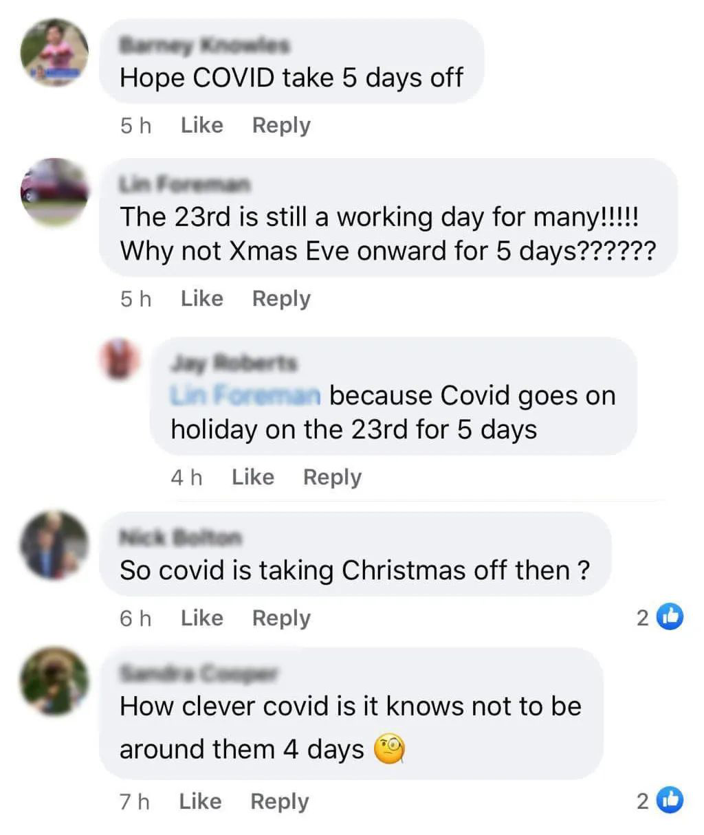 英格蘭、蘇格蘭、威爾士和北愛爾蘭領導人上周達成協(xié)議,在5天圣誕節(jié)假期內(nèi),3個家庭的成員可以聚在一起。但在12月28日以后,限制措施將恢復實行。