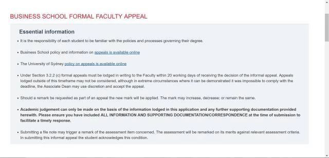 學(xué)生可就“非正式申訴階段”沒有解決的問題,向faculty提出進(jìn)一步申訴。該階段要求學(xué)生在非正式投訴最終結(jié)果出來的20個工作日內(nèi)填寫Formal Appeal From并提交給Student Information Office繼續(xù)申訴。一般遞交申訴的在10個工作日內(nèi)會收到來自Dean給出的Written Decision。
