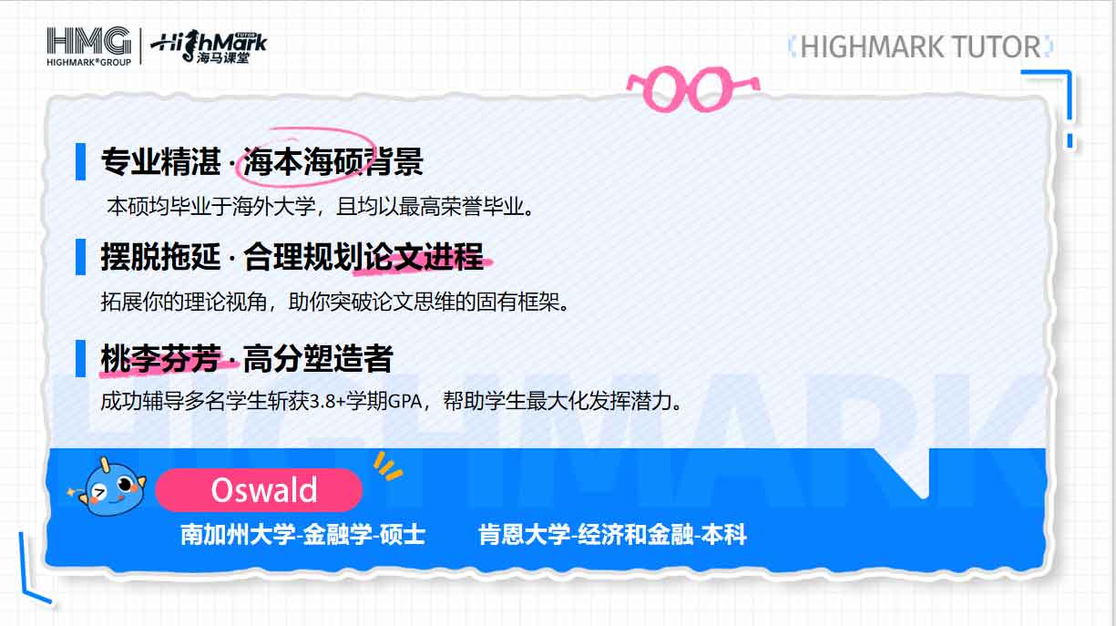 在留學(xué)生的學(xué)業(yè)之路上,找到一位既懂專業(yè)、又懂方法的導(dǎo)師,往往能起到“點石成金”的效果。本期海馬課堂為大家繼續(xù)推薦5位新銳導(dǎo)師——他們來自不同學(xué)科領(lǐng)域,擁有深厚的學(xué)術(shù)背景和豐富的輔導(dǎo)經(jīng)驗,將為同學(xué)們的學(xué)習(xí)之旅提供堅實支持。