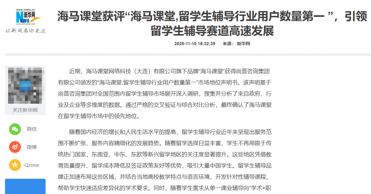 近日,海馬課堂再次迎來重要里程碑:憑借卓越的教學(xué)實力與持續(xù)增長的用戶口碑,海馬課堂獲評“留學(xué)生輔導(dǎo)行業(yè)用戶數(shù)量第一”,成為行業(yè)發(fā)展新標(biāo)桿。該榮譽由尚普咨詢集團(tuán)有限公司基于對全國留學(xué)生輔導(dǎo)市場的系統(tǒng)性調(diào)研與多維數(shù)據(jù)分析正式頒發(fā)。消息發(fā)布后,在留學(xué)輔導(dǎo)行業(yè)內(nèi)引發(fā)廣泛關(guān)注,新華網(wǎng)等權(quán)威媒體相繼報道與肯定。