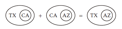 所謂的中項——這里是加州——從結(jié)論中消失了。它的作用僅限于建立其他兩個項(德克薩斯州和亞利桑那州)之間的聯(lián)系。這里用到的圖示法在形式邏輯中被稱為文式圖。通過這種方式,可以直觀地看出,結(jié)論是從兩個前提中得出的。