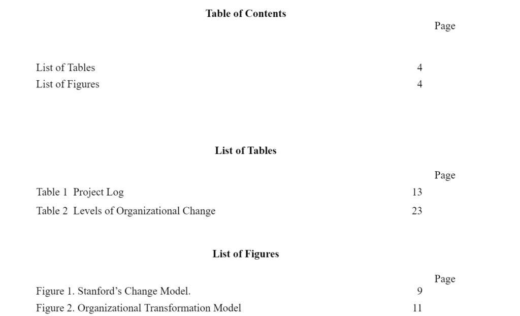 標題將不是“目錄”,而是“表格列表”和“圖表列表”。(下面的目錄示例中提供了一個示例。)