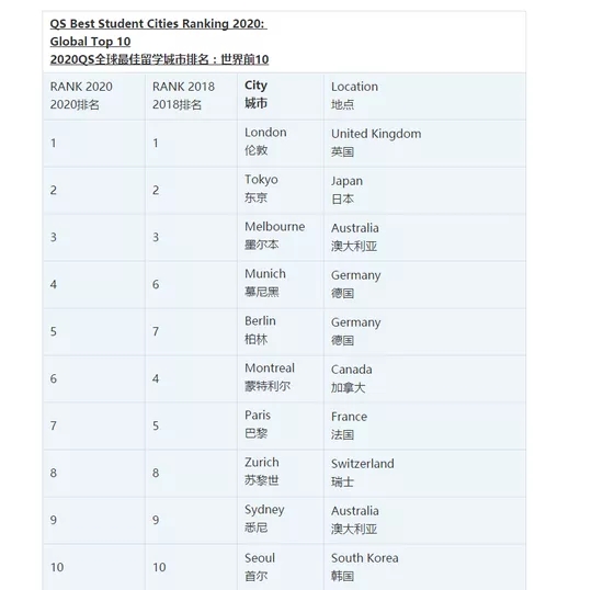 此前,倫敦時間2019年7月31日,QS全球教育集團(tuán)發(fā)布了最新全球最佳留學(xué)城市排名。