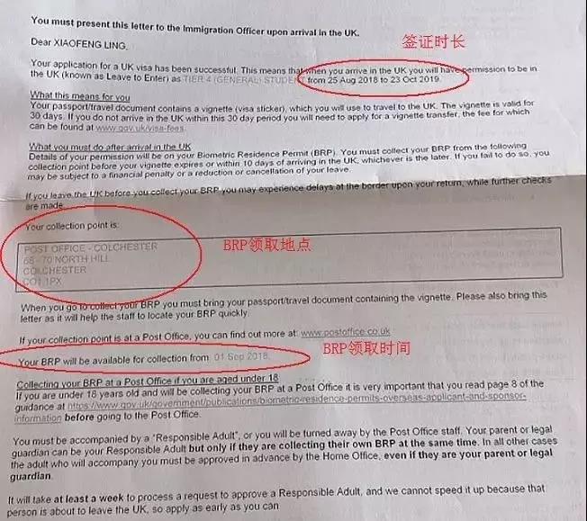 圖中方框部分就是 BRP 卡的領(lǐng)取地點,橢圓標(biāo)注處會告知大家 BRP 卡的領(lǐng)取時間。大部分同學(xué)前往郵局(Post Office)領(lǐng)卡即可,具體需要去哪個郵局通常是根據(jù)提交簽證申請時所提供的郵編來確定的。